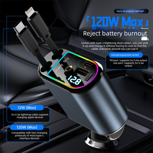 120W 4-in-1 Retractable Car Charger Adapter Fast Charging Dual Cables Type-C & Lightning LED Voltage Display Starry Projector for iPhone Samsung
